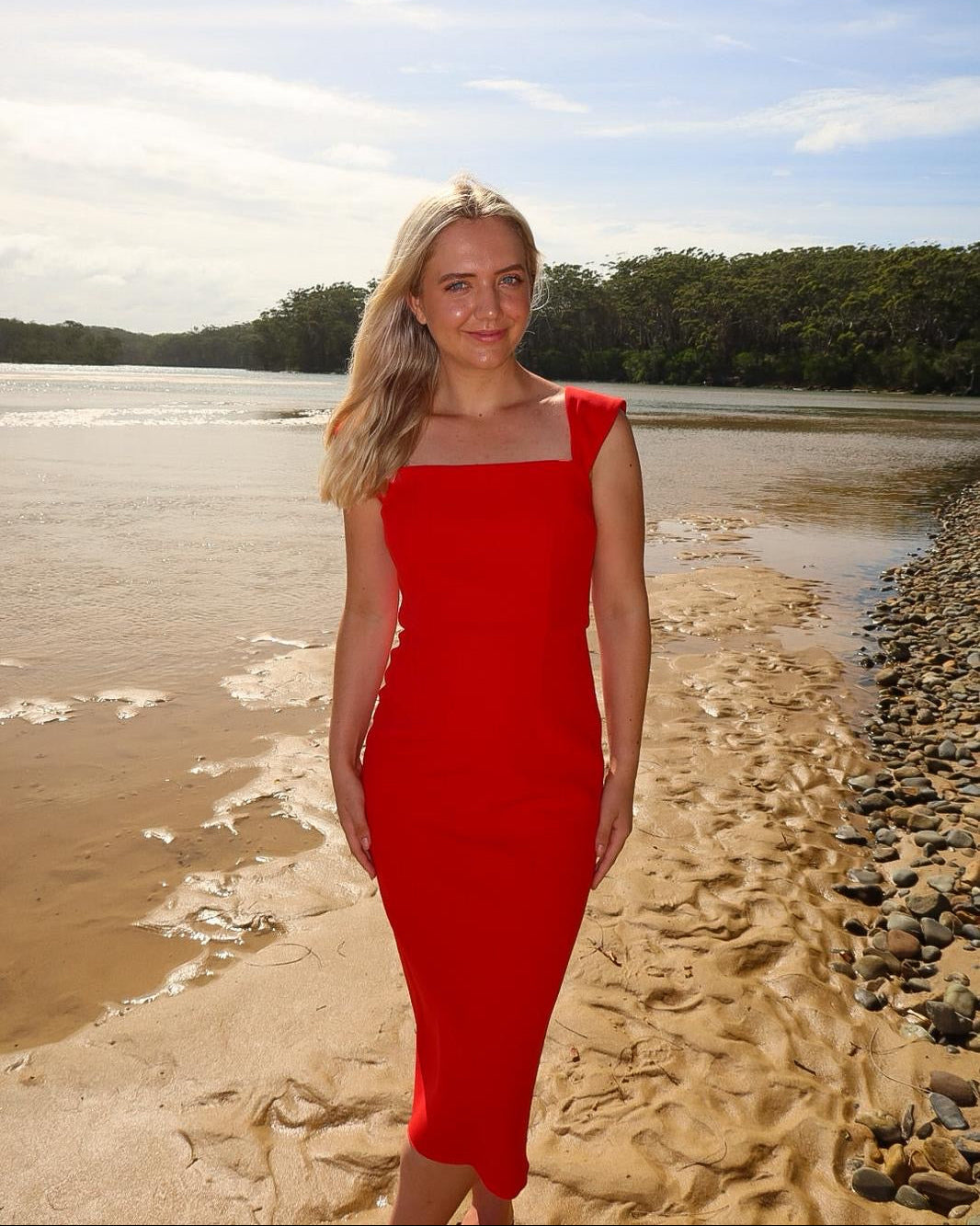 Red Short Sleeve Double Crepe Midi